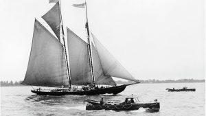 The big fishing schooners of the Grand Banks sailing from Gloucester, Massachusetts, and Lunenburg, Nova Scotia, were certainly fast and not bothered in the slightest by wind, so a movement arose to put on schooner races between the US and Canada, ‘to show what real sailors can do’. A newspaper in Nova Scotia donated a trophy that started a series of races between the wars that became legendary for hard driving in sometimes desperate conditions.