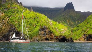 Pelagic Australis anchored off Quest Bay on Gough Island. Photo: Skip Novak