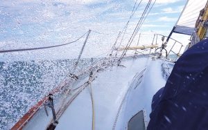 Then a wave broke over the boat and washed my feet from under me. Without boots, my socks slipped on the smooth gelcoat like fried eggs in a pan. This left me horizontal in the water, holding onto the keel while the wave washed over me.